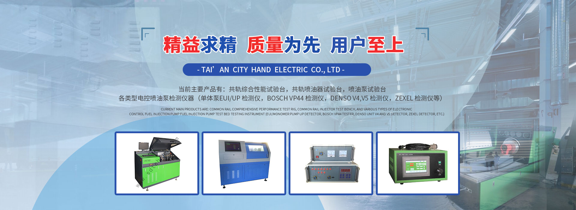 泰安市漢德電氣有限責任公司是設計、制造和生產內燃機檢測試驗設備的企業,集生產制造、配件銷售為一體。隨著全球環境對環保要求的日益提高,內燃機技術相應取得長足進步,尤其是柴油機噴射系統正向著高壓、電控技術的方向迅猛發展,基于此,我們公司目前著力開發、拓展專門針對于高壓共軌系統和其他電控噴射系統的檢測設備,當前主要產品有:共軌綜合性能試驗臺,共軌噴油器試驗臺,噴油泵試驗臺,各類型電控噴油泵檢測儀器...